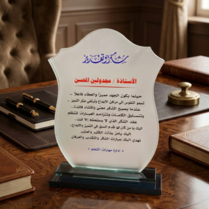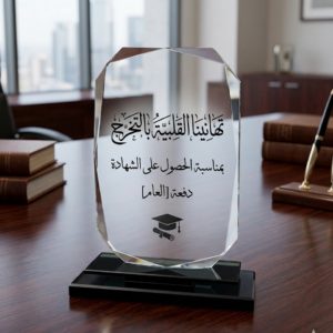 عن المنتج: درع تكريمي يجمع بين متانة الأكريليك وفخامة المظهر. يتميز بوزن خفيف ونقاء فائق، مما يجعله الخيار الأمثل للمناسبات التعليمية والشركات.