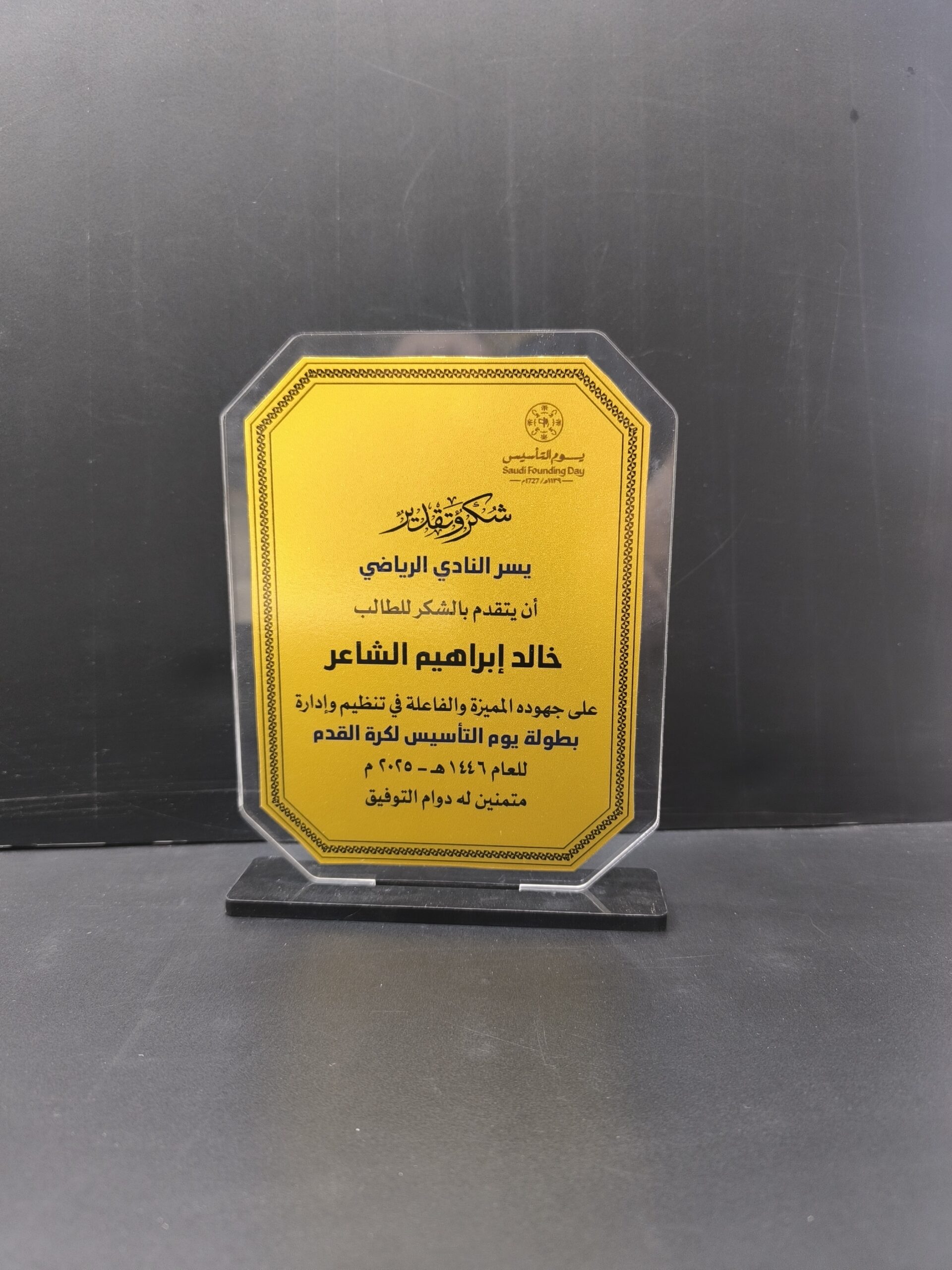 ودرع الأكريليك هو خيار مثالي لتكريم الأفراد في مختلف المجالات بفضل مظهره العصري، ومرونته في التخصيص، ودوام استخدامه. إنه يعكس الفخامة والجودة في نفس الوقت ويُعد خيارًا مفضلًا للمناسبات التي تستحق الاحتفال.