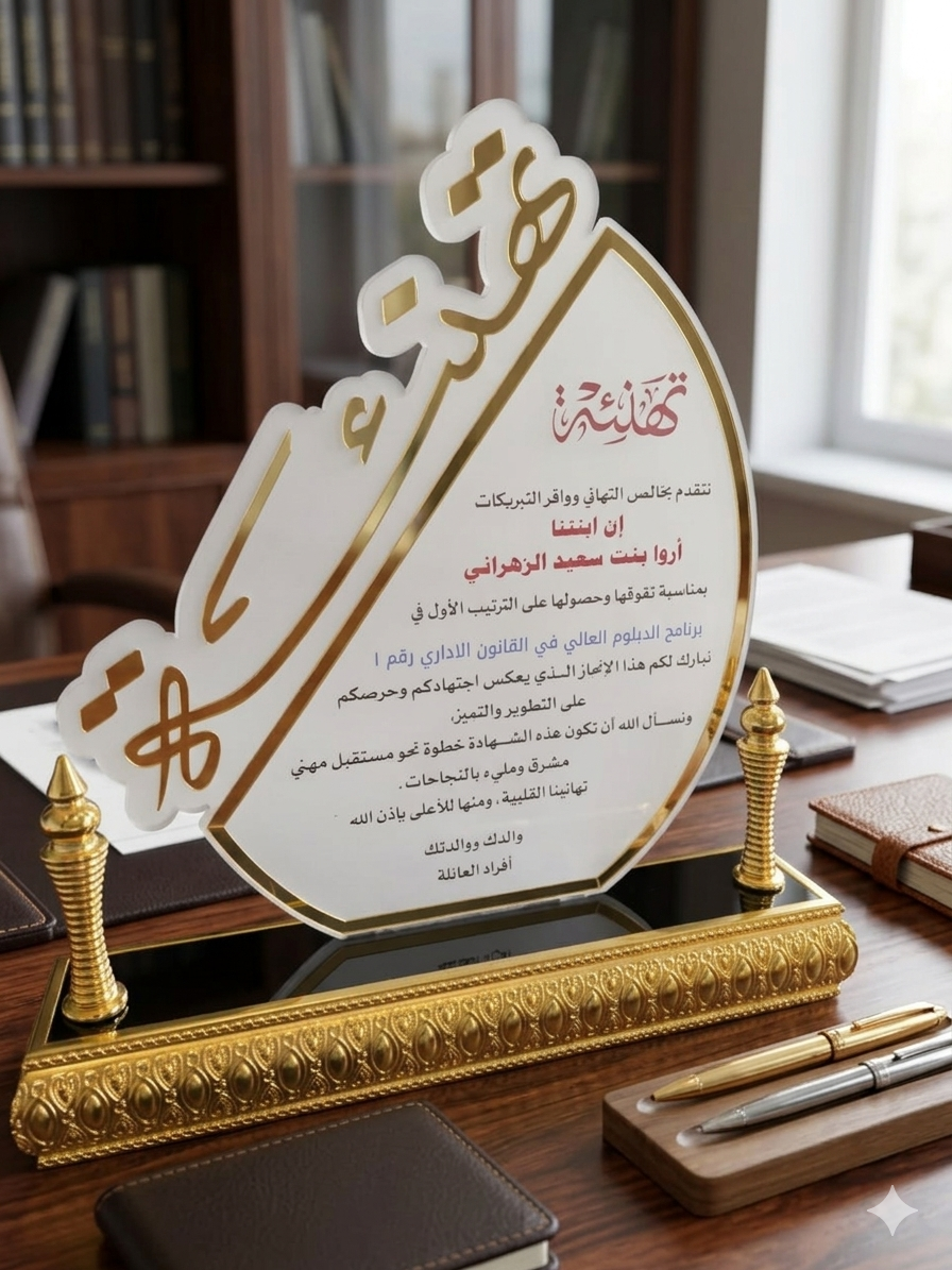 • درع “تهنئة” الإبداعي (الصورة الثانية): تصميم عصري بكلمة “تهنئة” بارزة بطلاء ذهبي على أكريليك أبيض نقي، مع قاعدة ذهبية كلاسيكية، مثالي لتكريم الأوائل والخريجين المتميزين.
