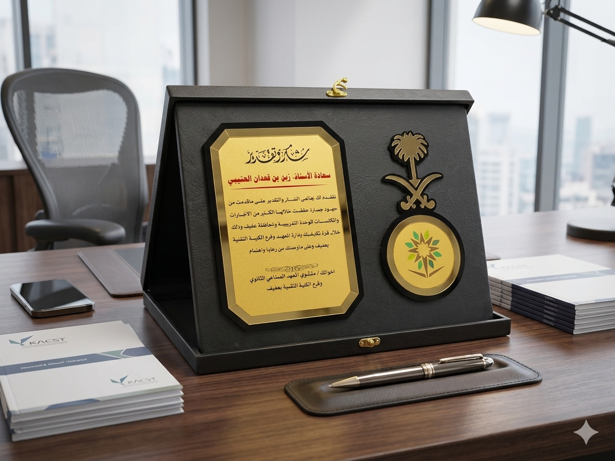 • لوحة تخصيص ذهبية: مساحة واسعة لنقش اسم المستلم، رتبته، وتاريخ المناسبة بصياغة أدبية راقية تعبر عن عمق التقدير، مع إمكانية إضافة الأعلام (السعودي والكويتي كما هو موضح) وشعارات الكليات أو الوحدات العسكرية.