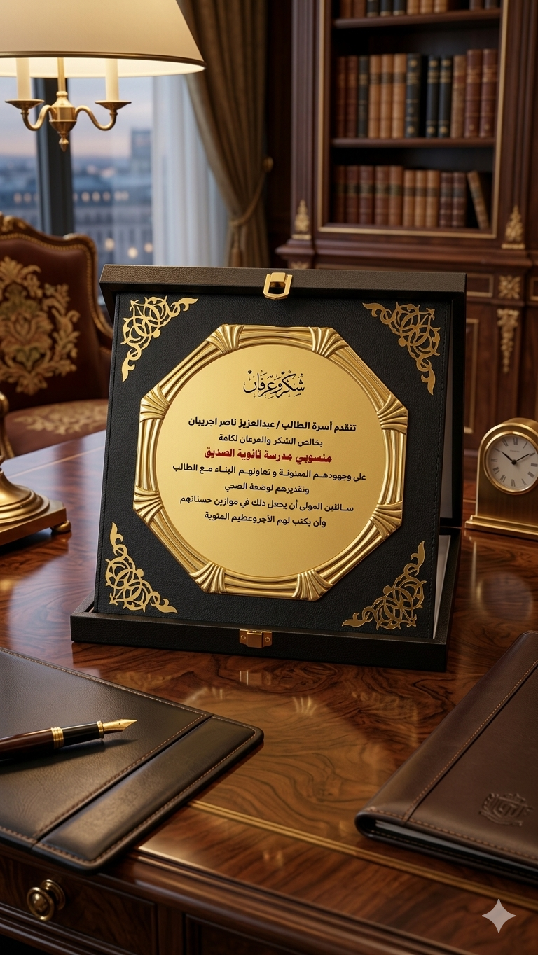 “اجعل كلمات شكرك تدوم للأبد في قطعة فنية لا تُنسى. اطلب درع السفراء الآن وعبّر عن تقديرك بأسلوب يليق بالكبار.”