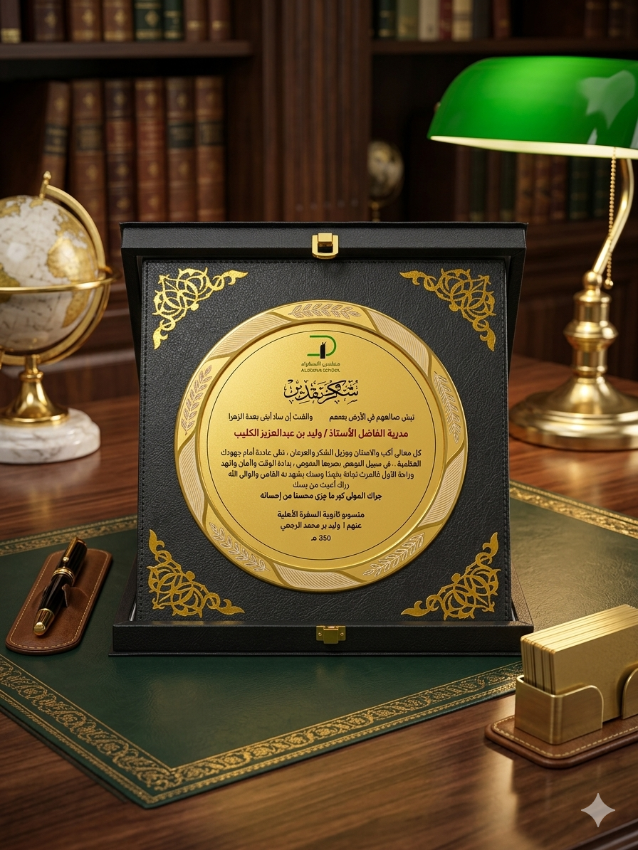 عندما يكون الإنجاز استثنائياً، يجب أن يكون التكريم موازياً له في الفخامة. نقدم لكم درع جلد  ، القطعة الأكثر رقيّاً لتخليد لحظات الشكر والتقدير. صُمم هذا الدرع بعناية فائقة ليجمع بين كلاسيكية الجلد الأسود المطرّز بالذهب وعصرية اللوحة الدائرية المصقولة، مما يجعله الخيار الأول لتكريم الشخصيات القيادية والمدراء والمبدعين. بفضل تصميمه المهيب، يضفي هذا الدرع لمسة من الهيبة والوقار على أي مكتب يوضع فيه.