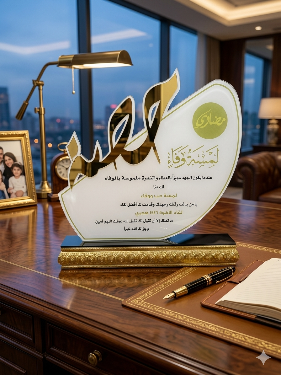 تصميم عصري وفريد: يتميز الدرع بدمج انسيابي بين الأكريليك الأبيض الفاخر والخط العربي المطلي بالذهب، مما يضفي لمسة ملكية على أي مكتب أو زاوية يوضع فيها.