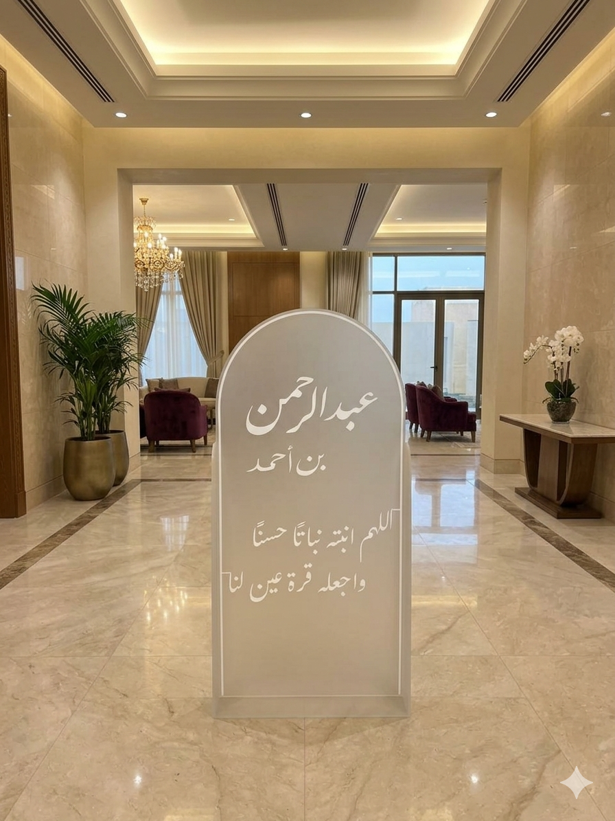 أضف لمسة فخامة وأناقة إلى ممر الاستقبال في قاعة الحفلات أو مدخل المنزل مع هذا الاستاند الاكرليك الفريد. يتميز بتصميم عصري شفاف مُزين بنقوش خط عربي أنيقة لمباركة المواليد الجدد