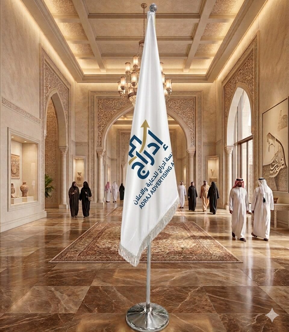 علم ملكي مصنع من أجود أنواع الستان المزدوج، يتميز بلمعة مطفية راقية . محاط بـ دناديش كثيفة تمنحه مظهراً بروتوكولياً فاخراً، مصمم خصيصاً للمكاتب التنفيذية والقاعات الرسمية ليكون رمزاً للانتماء بأعلى معايير الجودة.