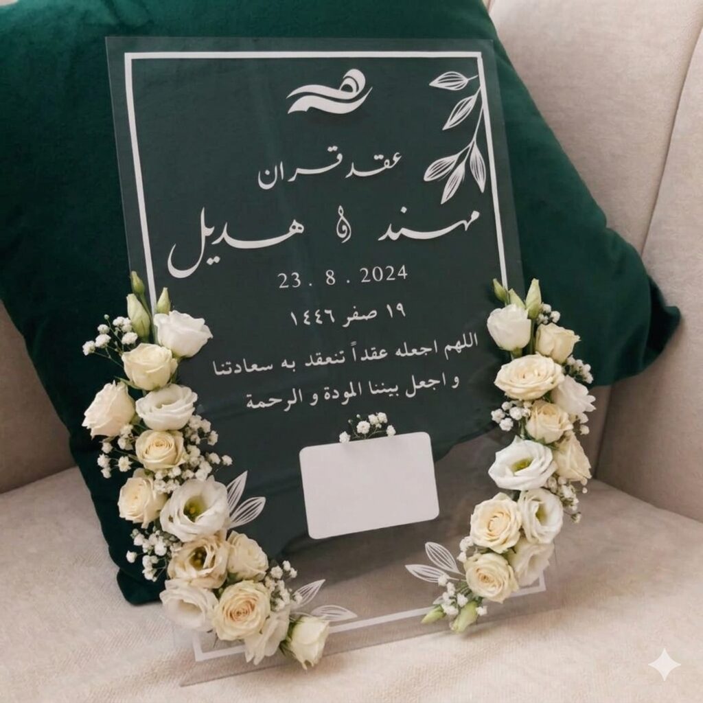 اجعل لحظة “نعم” الأبدية محفورة في ذاكرتكم بأسلوب عصري وأنيق. نقدم لكم لوحة عقد القران المصنوعة من أجود أنواع الأكريليك الشفاف، المصممة خصيصاً لتكون قطعة فنية توثق أجمل أيام العمر.