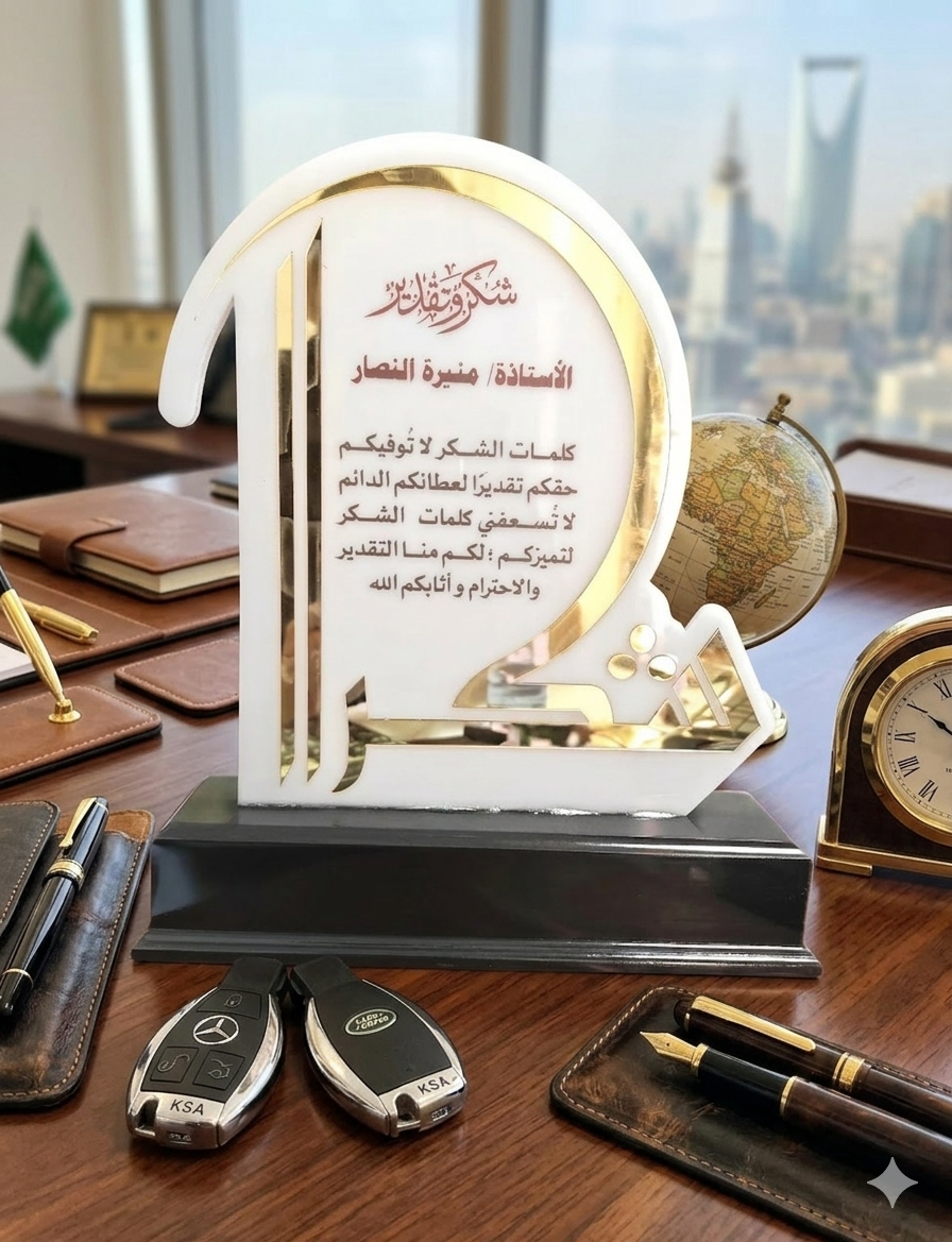 “اكتشف أفخم الدروع التذكارية المصممة من الأكريليك الأبيض واللمسات الذهبية الملكية. دروع تكريم فاخرة قابلة للتخصيص بالاسم وعبارات الشكر، مثالية للمدراء والموظفين. اطلب الآن لتخليد لحظات الإنجاز.”