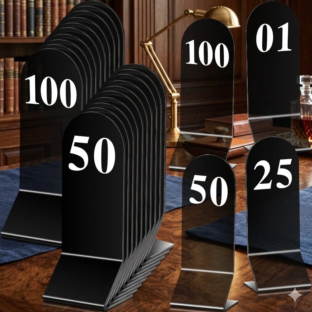 تميز بتقديم خدمة استثنائية مع أرقام الطاولات المصنوعة من الأكرليك الأسود الملكي بتفاصيل ذهبية راقية. تصميم عصري على شكل (V) يضمن الثبات التام والرؤية الواضحة من الجهتين.