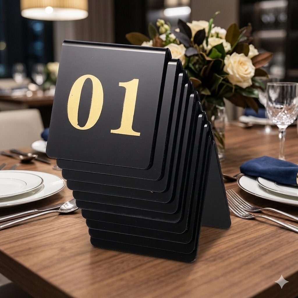 تميز بتقديم خدمة استثنائية مع أرقام الطاولات المصنوعة من الأكرليك الأسود الملكي بتفاصيل ذهبية راقية. تصميم عصري على شكل (V) يضمن الثبات التام والرؤية الواضحة من الجهتين.
