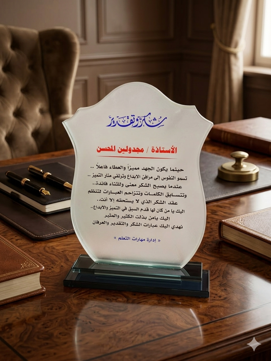 نحن ندرك أن الدرع ليس مجرد قطعة ديكور، بل هو رسالة شكر وتقدير. لذلك، نستخدم تقنيات حديثة تضمن عدم تغير لون الكريستال أو باهت الحفر مع مرور الزمن، ليبقى الذكرى نابضة بالحياة للأبد.