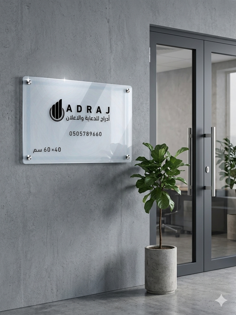 اجعل هويتك البصرية تتحدث عنك! نقدم لك لوحة الأكريليك الشفافة المصممة بأسلوب “المودرن” البسيط، والتي تضفي طابعاً من الاحترافية والشفافية على مكاتب الخدمات، الشركات، أو حتى المراكز التقنية.
