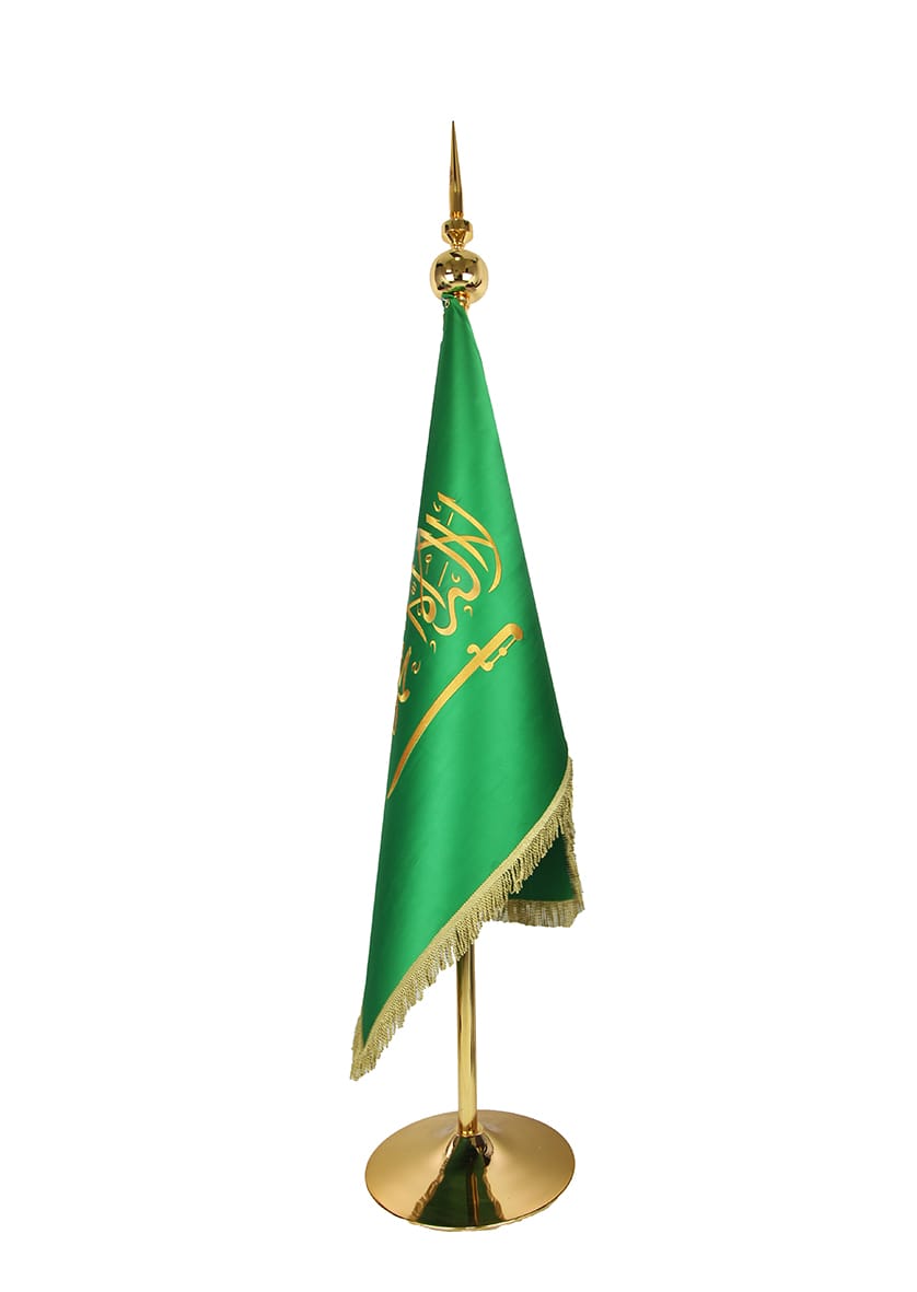 علم مكتبي فاخر مصمم خصيصاً للمكاتب والقاعات الرسمية. يجمع بين دقة التنفيذ ومعايير الهوية الوطنية، مع إضافة لمسات جمالية من الدناديش الذهبية او البيضاء و التي تمنحه طابعاً بروتوكولياً فريداً.