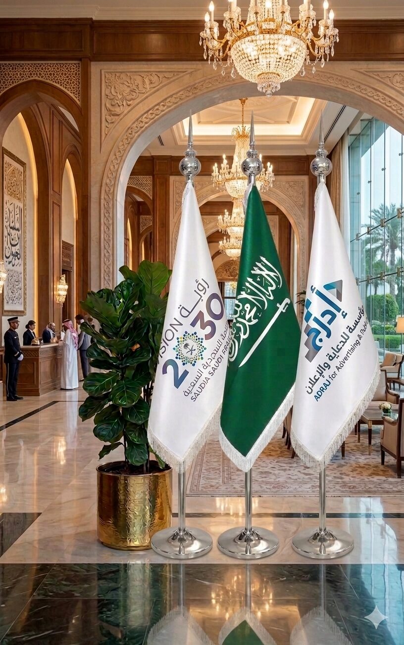 علم مكتبي فاخر مصمم خصيصاً للمكاتب والقاعات الرسمية. يجمع بين دقة التنفيذ ومعايير الهوية الوطنية، مع إضافة لمسات جمالية من الدناديش الذهبية او البيضاء و التي تمنحه طابعاً بروتوكولياً فريداً.